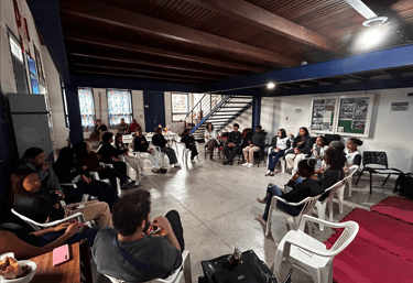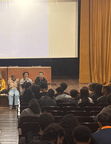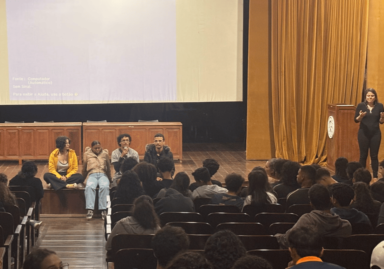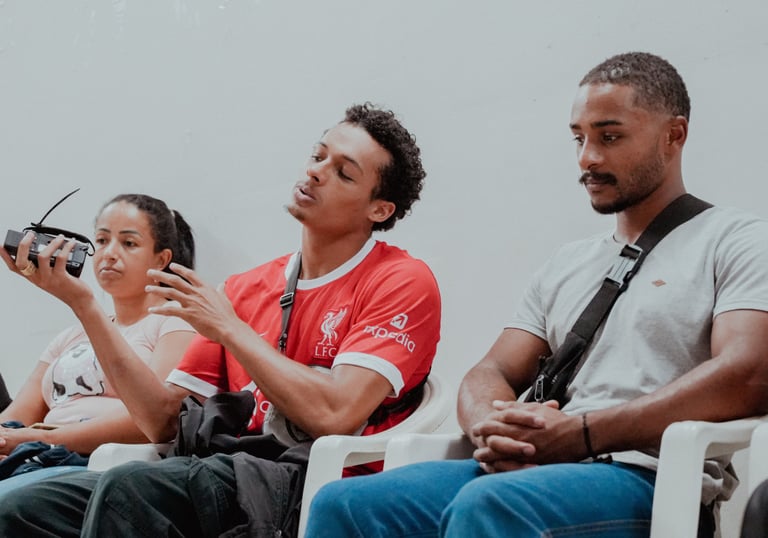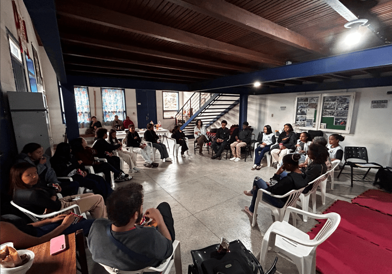 A atividade aconteceu na Casa de Cultura Negra, em diálogo direto com adolescentes do coletivo Olhares (Im)possíveis e estudantes da Escola Municipal Aleijadinho, localizada no subdistrito de Santo Antônio do Salto, distrito de Ouro Preto. O encontro promoveu troca de experiências, relatos de território e visões de mundo distintas, conectadas pela vivência periférica e pela prática audiovisual. Ao final, os grupos assistiram aos filmes produzidos por ambos, em parceria com o forumdoc.bh, fortalecendo a ideia de cinema como espaço de escuta, circulação e construção coletiva de sentidos.